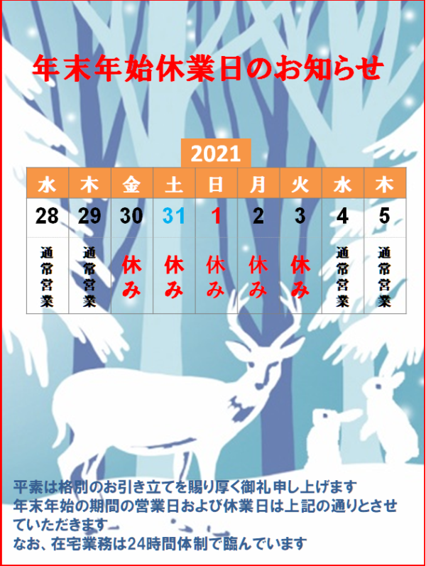 年末年始休業日等のご案内